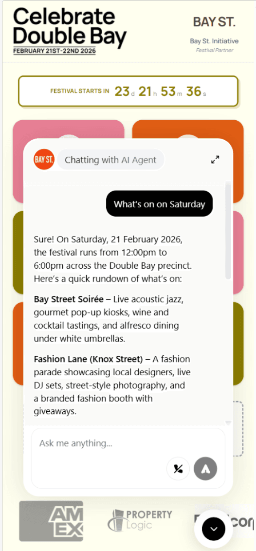An always-on AI assistant that answers common questions before and during the event — reducing pressure on council staff, volunteers and information desks.
