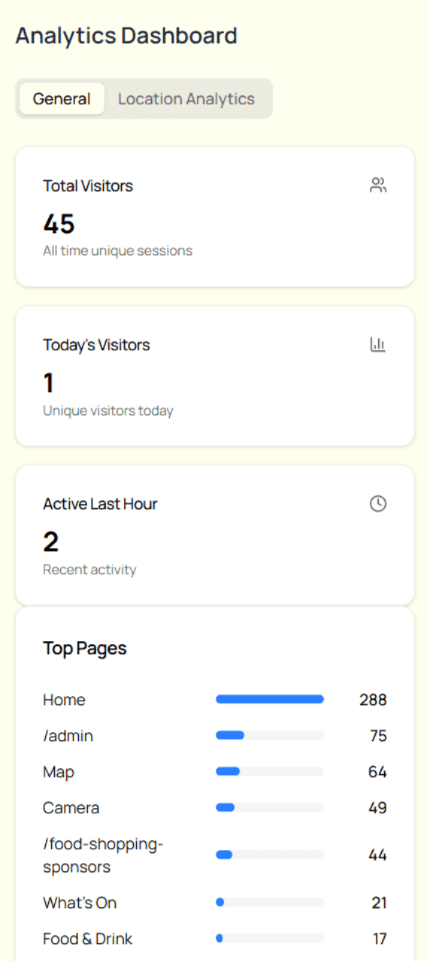 Receive a post-event insights report showing engagement, popular areas, common questions and usage — supporting reporting, funding applications and future planning.